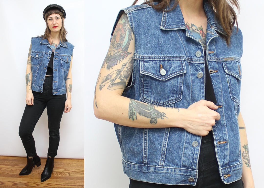 Vintage 90 s CK Blue Denim Vest 1990 s Cut Off Sleeve Ruby Threads Vintage College Park MD Very well made.
