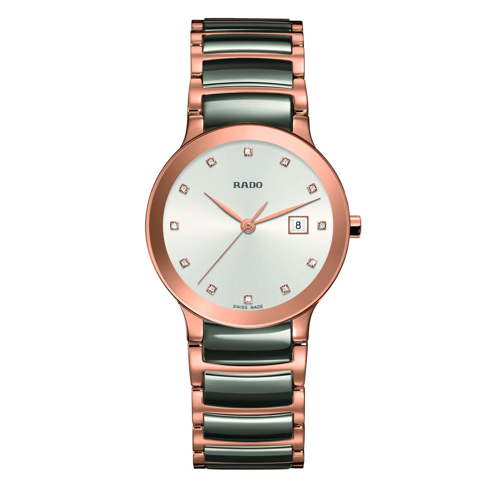 Rado Centrix 28mm Ceramic and Rose Gold PVD Diamond Ladies Watch R30555762 28 mm Silver Dial Beaverbrooks Very well made.